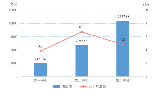根据地区生产总值统一核算结果,全年全省地区生产总值22667.12亿元,比上年增长5.3%。其中,第一产业增加值2971.66亿元,比上年增长3.8%,占地区生产总值的比重为13.1%;第二产业增加值7097.58亿元,增长6.7%,占地区生产总值的比重为31.3%;第三产业增加值12597.88亿元,增长4.8%,占地区生产总值的比重为55.6%。全年人均地区生产总值58685元,比上年增长5.2%。