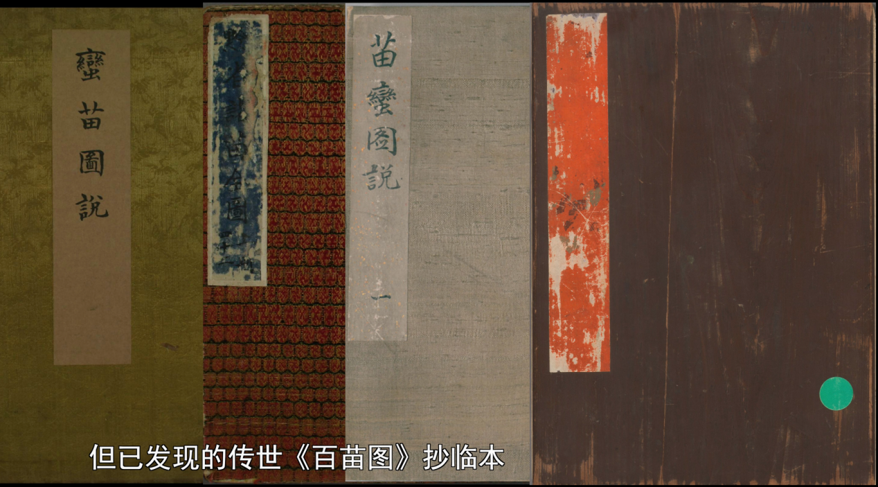 《八十二种苗图并说》原书已经遗失,但已发现的传世《百苗图》抄临本有12种。这些抄本是清代彩绘于纸和绢上图文并茂的稀世珍品,画册是以苗族为主的多民族地区的人文景观、耕作渔猎、织染服饰、婚丧嫁娶、歌舞饮食、宗教信仰等诸多生活领域的真实写照。