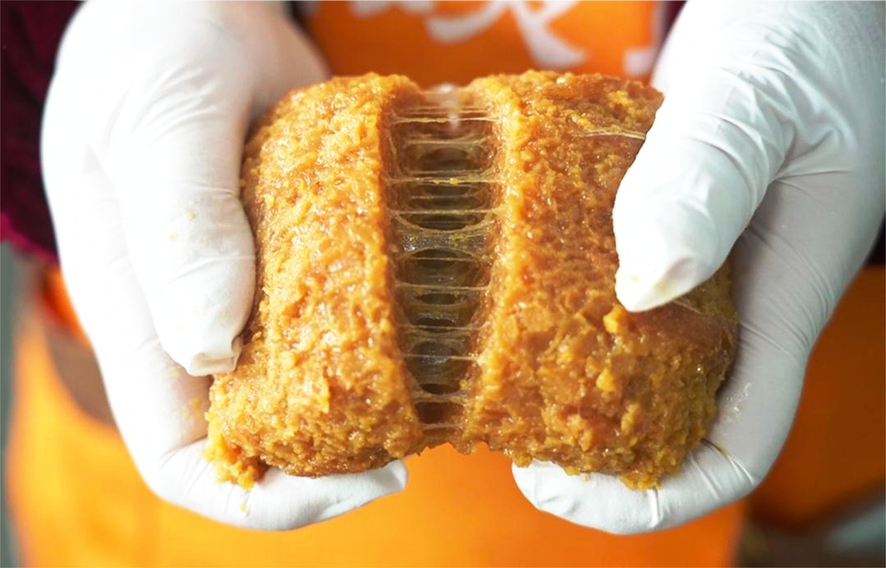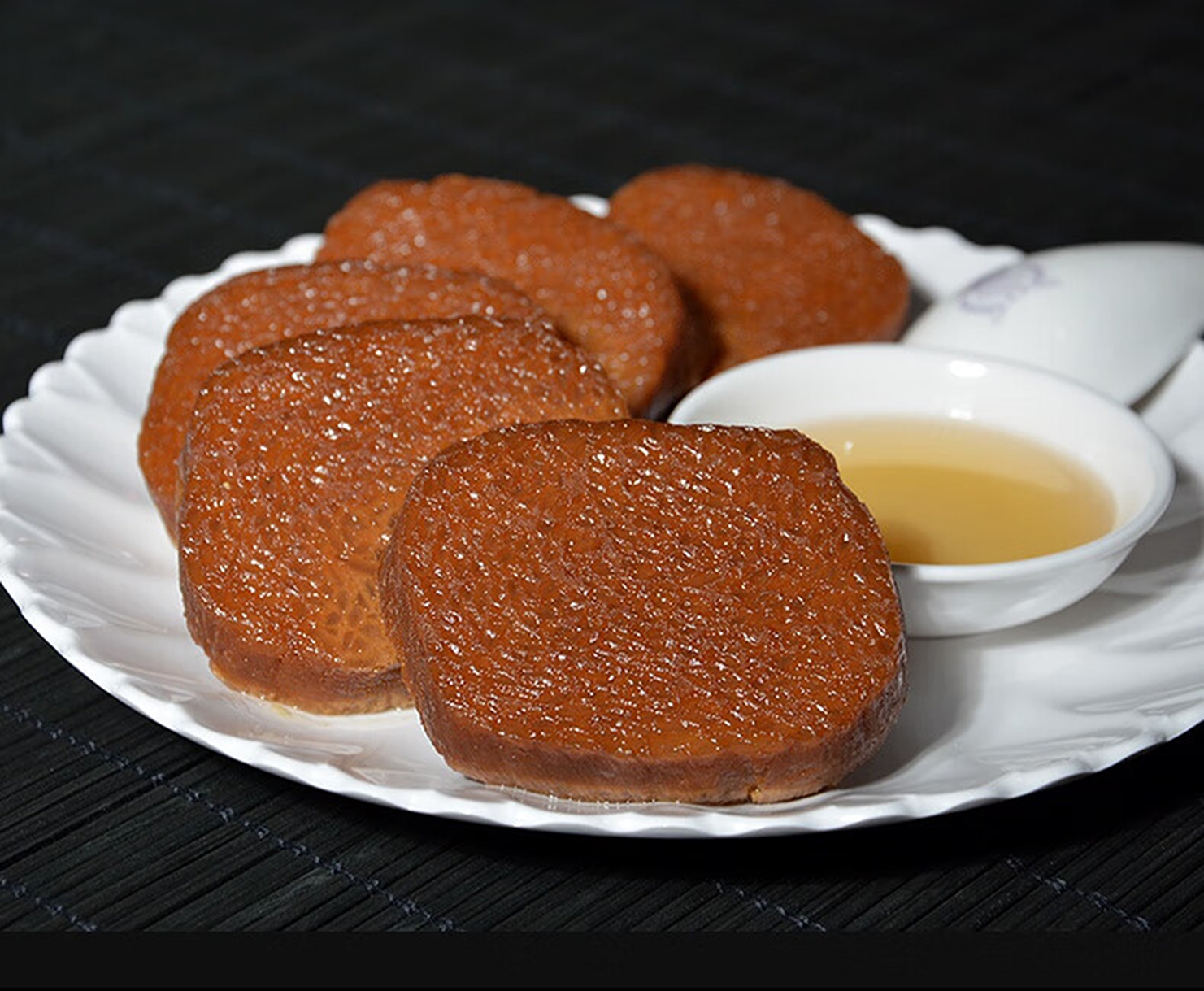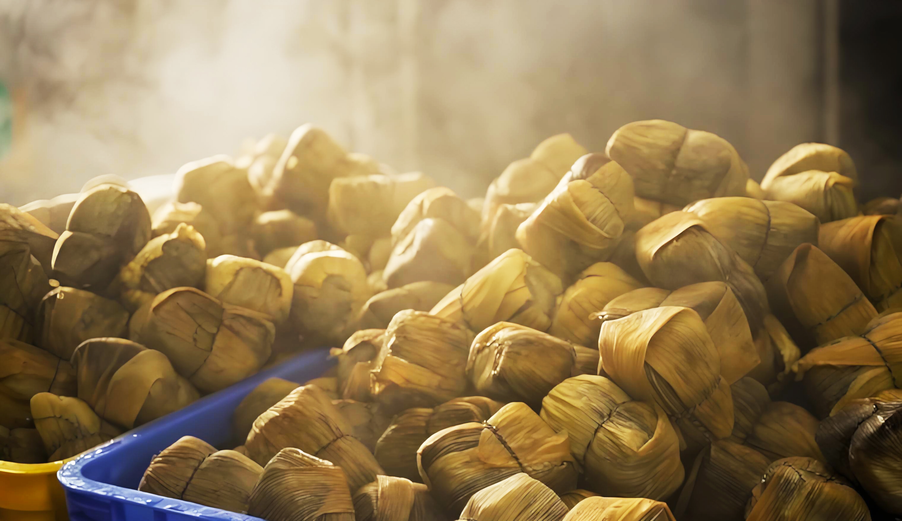 清镇黄粑的诞生,离不开这片土地的丰饶滋养。清镇位于北纬26°的黄金气候带,湿润多雨、土壤肥沃,孕育出颗粒饱满的黄豆、糯稻与香米。当地人传承匠人精选本地粳米与糯米按古方配比,佐以山泉浸泡磨浆,再以传统木甑密闭蒸制。经过漫长的发酵与12小时以上柴火蒸炼中,米糖自然转化,箬叶清香渗透,终成金黄如玉、甜润不腻的至臻风味。
