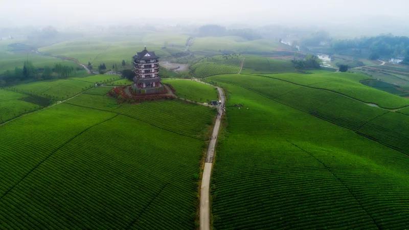 站在八角山巅俯瞰,在一层薄薄的雾霭下,是浩瀚无垠的万亩茶海,一眼望去好似人间仙境。