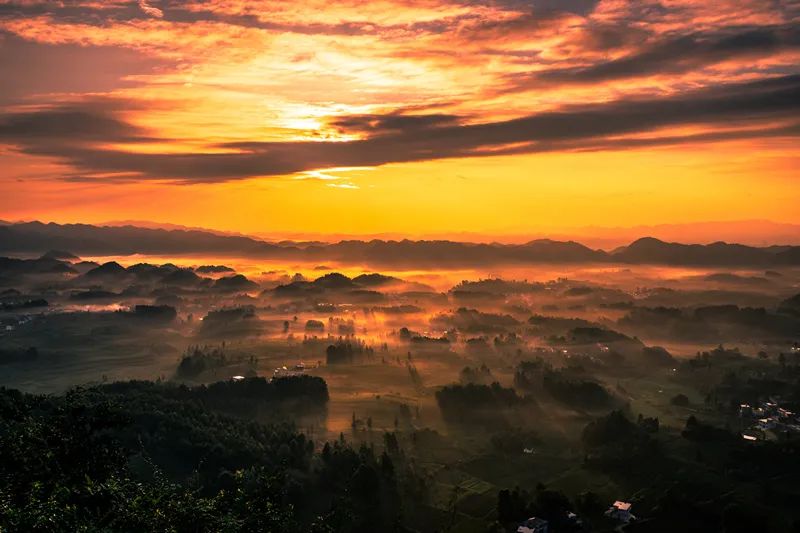 湄潭县复兴镇八角山,是喜爱日出云海的摄影者的绝佳去处。晨光微亮,云海紧跟着日出,在群山之间翻涌滚动,云雾缥缈。“远看此山八个角,近看此山八个脚”,就是八角山的美丽景象。