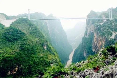 花江铁索桥始建于明代,桥宽3米,桥长72米,高70余米。她像一道倒挂的长虹,横卧在北盘江两岸的悬崖峭壁之间,上托青天一带,下吻浪花万朵,堪称花江大峡谷的一个奇观。我国著名地理学家徐霞客在《黔游记》中这样描述:“桥以铁索,东西属两岸上为经,以木板横之为纬”。