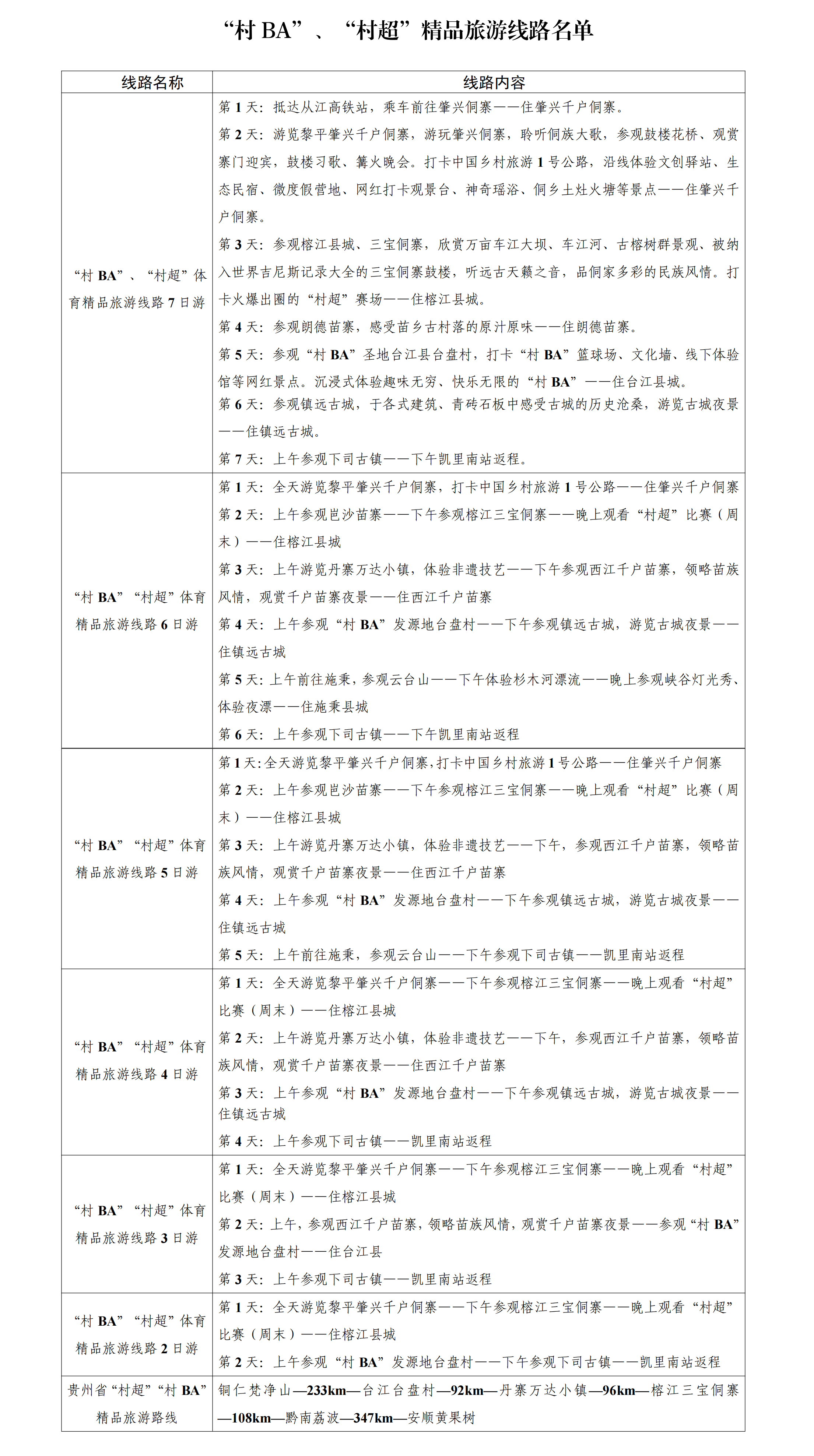 围绕“村BA”“村超”组织文旅活动。围绕体育赛事活动,推出“探索中国乡村旅游1号公路”,打卡“两村”之行,寻梦“千户苗寨西江、千户侗寨肇兴、千年古城镇远”的“三千”之旅等“123”品牌线路,联动丹寨、荔波、平塘、黄果树、梵净山等重点景区度假区,推出“村BA”村超精品旅游线路。