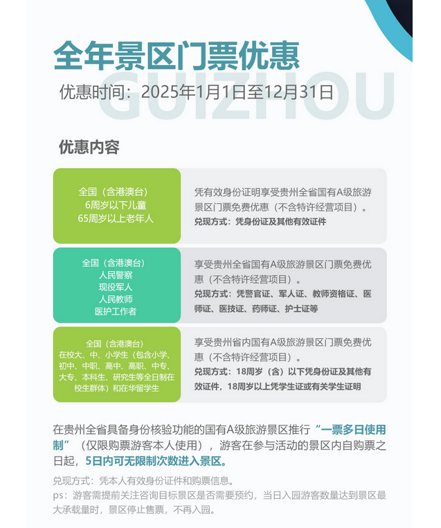2025年1月1日起,贵州将面向老年人、儿童、人民警察、现役军人、人民教师、医护工作者和学生等群体推出一系列文旅优惠活动,活动持续至2025年12月31日。6周岁以下儿童、65周岁以上老年人,人民警察、现役军人、人民教师、医护工作者以及学生凭有效身份证明等,可享受贵州省内国有A级景区门票免费优惠。(PS:全年免票游贵州的快乐真的值得多来几次!)