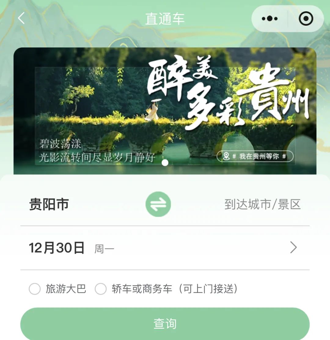 黔爽巴士:是专门为游客提供景区直通车出行购票服务的平台。目前,黔爽巴士·黔爽旅游已开通贵阳出发各大知名景区的直通车线路。游客提前一天关注“黔爽巴士”微信公众号,点击“我要坐车”后进入“黔爽旅游”进行购票预定,第二天到达站点乘车即可。