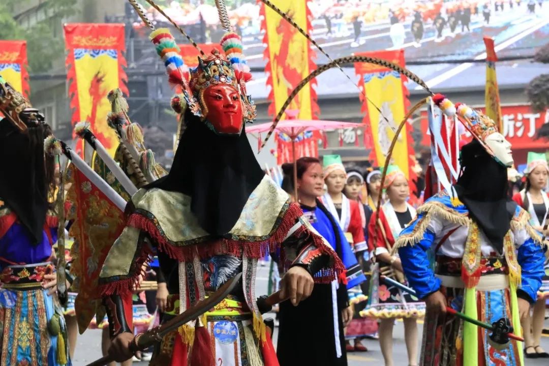 在“2025年5·19中国旅游日·贵州民族团结大巡游”活动中,由100名演职人员组成的安顺方阵惊艳亮相。方阵以国家级非遗安顺地戏为序章,40名地戏演员头戴精雕细琢的木质面具,身披战旗,在铿锵锣鼓声中演绎《地戏神韵》;紧随其后,20位身着凤阳汉装的屯堡嬢嬢,手持油纸伞优雅漫步,尽显古朴韵味。