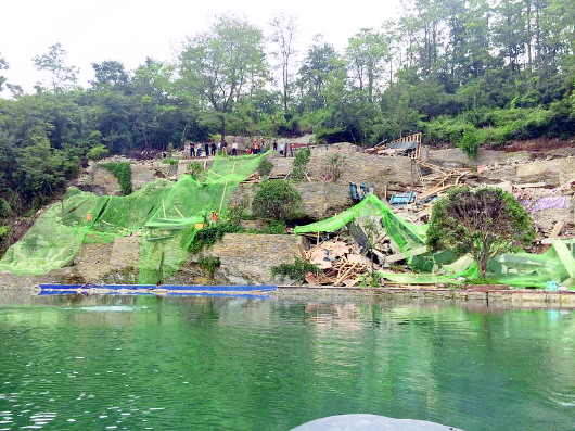 党武镇政府联合松柏山水库管理处联合行动,拆除库区违法修建行动,拆除浆砌石桥梁一座、钢架简易结构人行桥一座、违法修建堡坎500立方米;拆除一级保护区34栋3405平方米的违章建筑,并修复生态河道10万余平方米,4台挖掘机对硬化的河床进行功能性回填。