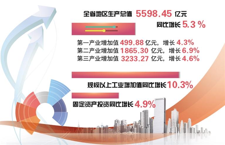 根据地区生产总值统一核算结果,一季度全省地区生产总值5598.45亿元,按不变价格计算,同比增长5.3%。其中,第一产业增加值499.88亿元,增长4.3%;第二产业增加值1865.30亿元,增长6.9%;第三产业增加值3233.27亿元,增长4.6%。