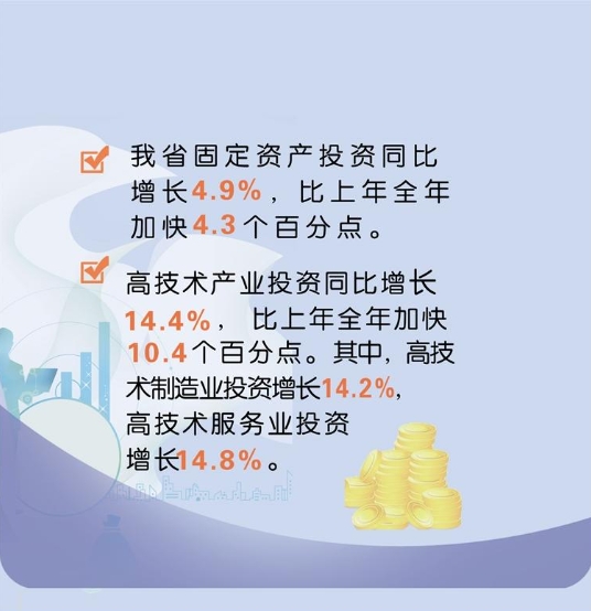 刚刚出炉的经济“一季报”显示:一季度,我省固定资产投资同比增长4.9%,比上年全年加快4.3个百分点,高于全国平均水平0.7个百分点;在此基础上,高技术产业投资同比增长14.4%,比上年全年加快10.4个百分点。