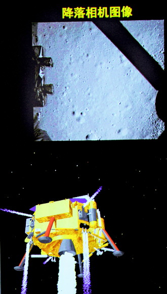 12月14日,嫦娥三号平稳落月,中国首次地外天体软着陆成功。这是北京飞行控制中心大屏幕上显示的嫦娥三号探测器和降落相机图像。新华社记者李鑫摄