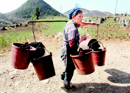特殊的地貌环境,必然造就了吭甲缺水的现实困境。村民杨发海说,本地人喝水主要有两种途径,一种是走一小时山路到山背后的水井挑水,但是水井出水少,村民都是排队守水,凌晨一两点摸黑守水是常态。另外一种就是用房顶的“天花水”,但是“天花水”常年在太阳底下暴晒,细菌多,也不干净,“但是为了活命,也得硬着头皮用啊。”