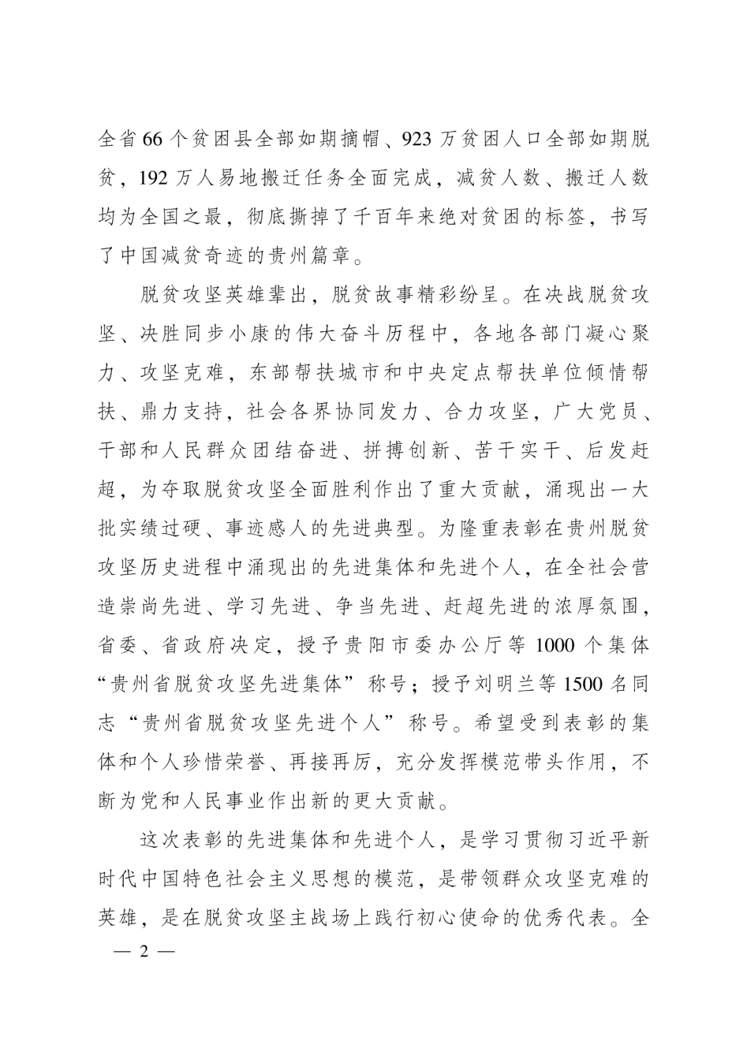脱贫攻坚英雄辈出,脱贫故事精彩纷呈。在决战脱贫攻坚、决胜同步小康的伟大奋斗历程中,各地各部门凝心聚力、攻坚克难,东部帮扶城市和中央定点帮扶单位倾情帮扶、鼎力支持,社会各界协同发力、合力攻坚,广大党员、干部和人民群众团结奋进、拼搏创新、苦干实干、后发赶超,为夺取脱贫攻坚全面胜利作出了重大贡献,涌现出一大批实绩过硬、事迹感人的先进典型。为隆重表彰在贵州脱贫攻坚历史进程中涌现出的先进集体和先进个人,在全社会营造崇尚先进、学习先进、争当先进、赶超先进的浓厚氛围,省委、省政府决定,授予贵阳市委办公厅等1000个集体“贵州省脱贫攻坚先进集体”称号;授予刘明兰等1500名同志“贵州省脱贫攻坚先进个人”称号。希望受到表彰的集体和个人珍惜荣誉、再接再厉,充分发挥模范带头作用,不断为党和人民事业作出新的更大贡献。
