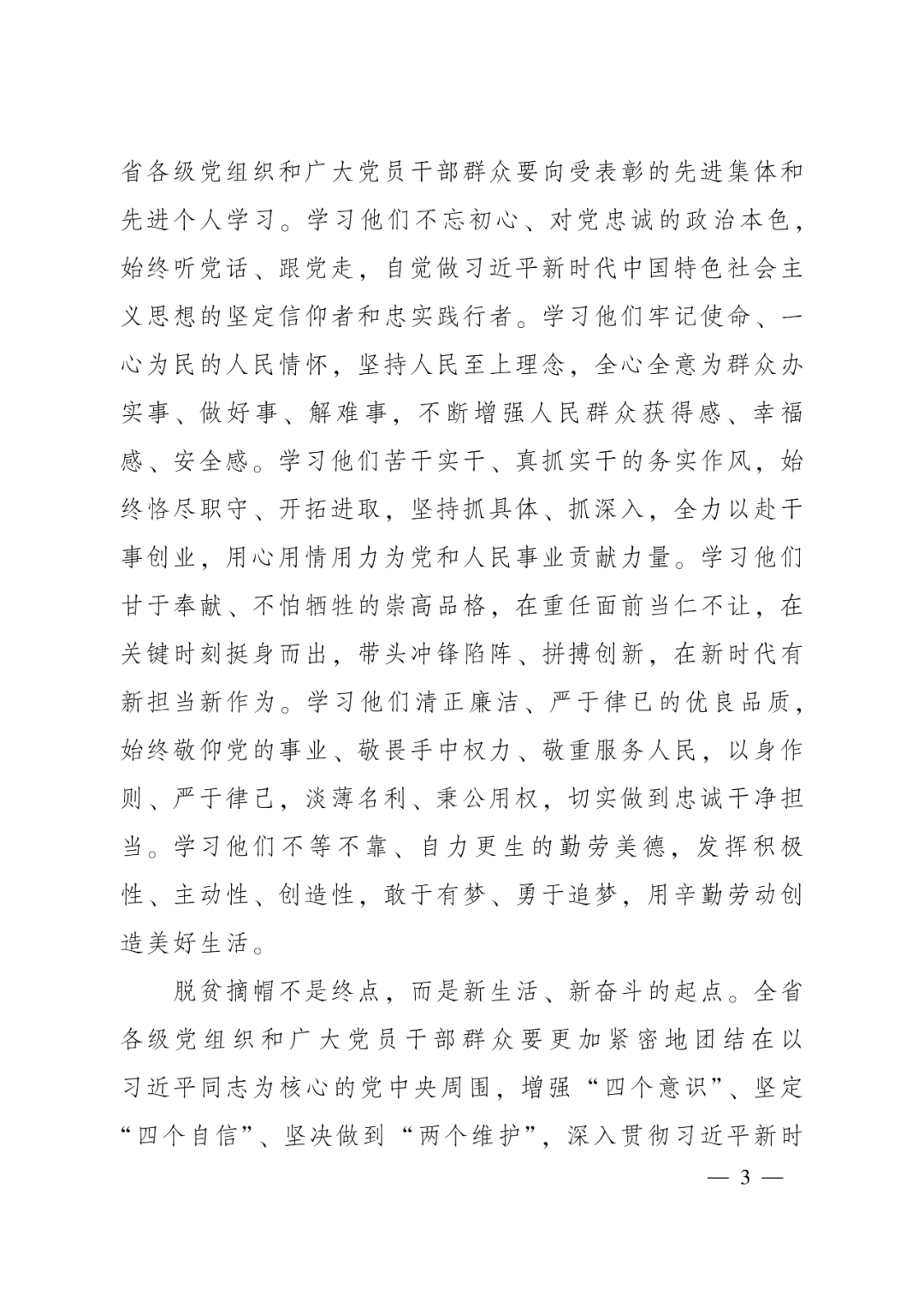 这次表彰的先进集体和先进个人,是学习贯彻习近平新时代中国特色社会主义思想的模范,是带领群众攻坚克难的英雄,是在脱贫攻坚主战场上践行初心使命的优秀代表。全省各级党组织和广大党员干部群众要向受表彰的先进集体和先进个人学习。学习他们不忘初心、对党忠诚的政治本色,始终听党话、跟党走,自觉做习近平新时代中国特色社会主义思想的坚定信仰者和忠实践行者。学习他们牢记使命、一心为民的人民情怀,坚持人民至上理念,全心全意为群众办实事、做好事、解难事,不断增强人民群众获得感、幸福感、安全感。学习他们苦干实干、真抓实干的务实作风,始终恪尽职守、开拓进取,坚持抓具体、抓深入,全力以赴干事创业,用心用情用力为党和人民事业贡献力量。学习他们甘于奉献、不怕牺牲的崇高品格,在重任面前当仁不让,在关键时刻挺身而出,带头冲锋陷阵、拼搏创新,在新时代有新担当新作为。学习他们清正廉洁、严于律己的优良品质,始终敬仰党的事业、敬畏手中权力、敬重服务人民,以身作则、严于律己,淡泊名利、秉公用权,切实做到忠诚干净担当。学习他们不等不靠、自力更生的勤劳美德,发挥积极性、主动性、创造性,敢于有梦、勇于追梦,用辛勤劳动创造美好生活。