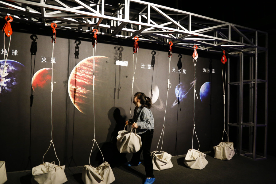 穿过晃动的光影桥和珠帘般的水晶宫,八大行星重量体验区让女汉纸般的多多感受到了不同星球之间的重量差距,看这吃力的表情就知道土星有多重了。
