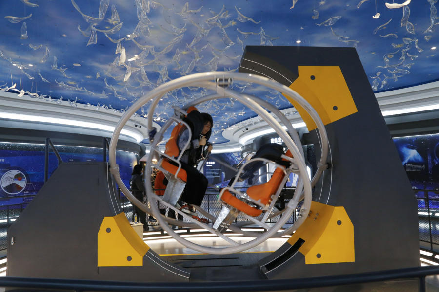 在天文体验馆旁,充满未来科技感的九号宇宙航天馆内,包含了各种各样的沉浸游览、航天互动体验、航天博物展示和科技娱乐项目。