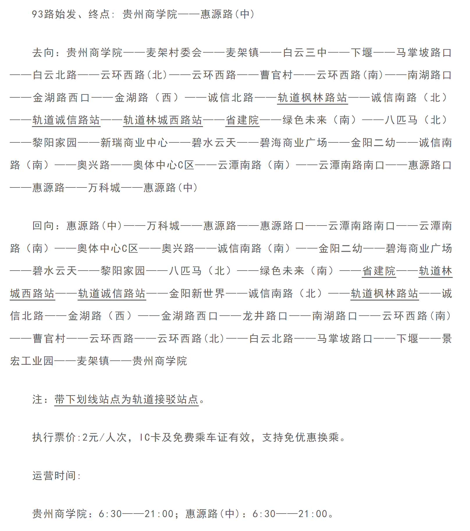 304路、观山3路暂停运营后,同步于12月6日新辟93路:贵州商学院——惠源路(中),解决万科城、碧海商业广场、贵州商学院、麦架镇区域市民的出行需求。