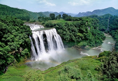 黄果树风景名胜区,平均海拔900米,总面积163平方公里,景区环境优美,空气清新,景色迷人,每立方厘米负氧离子含量2.8万个以上,素有天然大氧吧之称。景区内以黄果树大瀑布(高77.8米,宽101.0米)为中心,分布着雄、奇、险、秀风格各异的大小18个瀑布(黄果树瀑布、陡坡塘瀑布、银链坠潭瀑布、螺丝滩瀑布、星峡飞瀑、滴水滩瀑布、连天瀑布、冲坑瀑布、关脚峡瀑布、落叶瀑布、大树岩瀑布、蜘蛛岩瀑布、绿眉潭瀑布、下瓜瀑布、临潭瀑布、龙门飞瀑、三叉湾瀑布、挑水河瀑布,其中已开发黄果树瀑布、陡坡塘瀑布、银链坠潭瀑布、星峡飞瀑、龙门飞瀑等瀑布5个,未开发瀑布13个,形成一个庞大的瀑布家族,被大世界吉尼斯总部评为世界上最大的瀑布群,列入吉尼斯世界纪录。