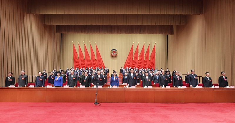 全体起立,高唱中华人民共和国国歌。张凯 刘杨 闻双 摄