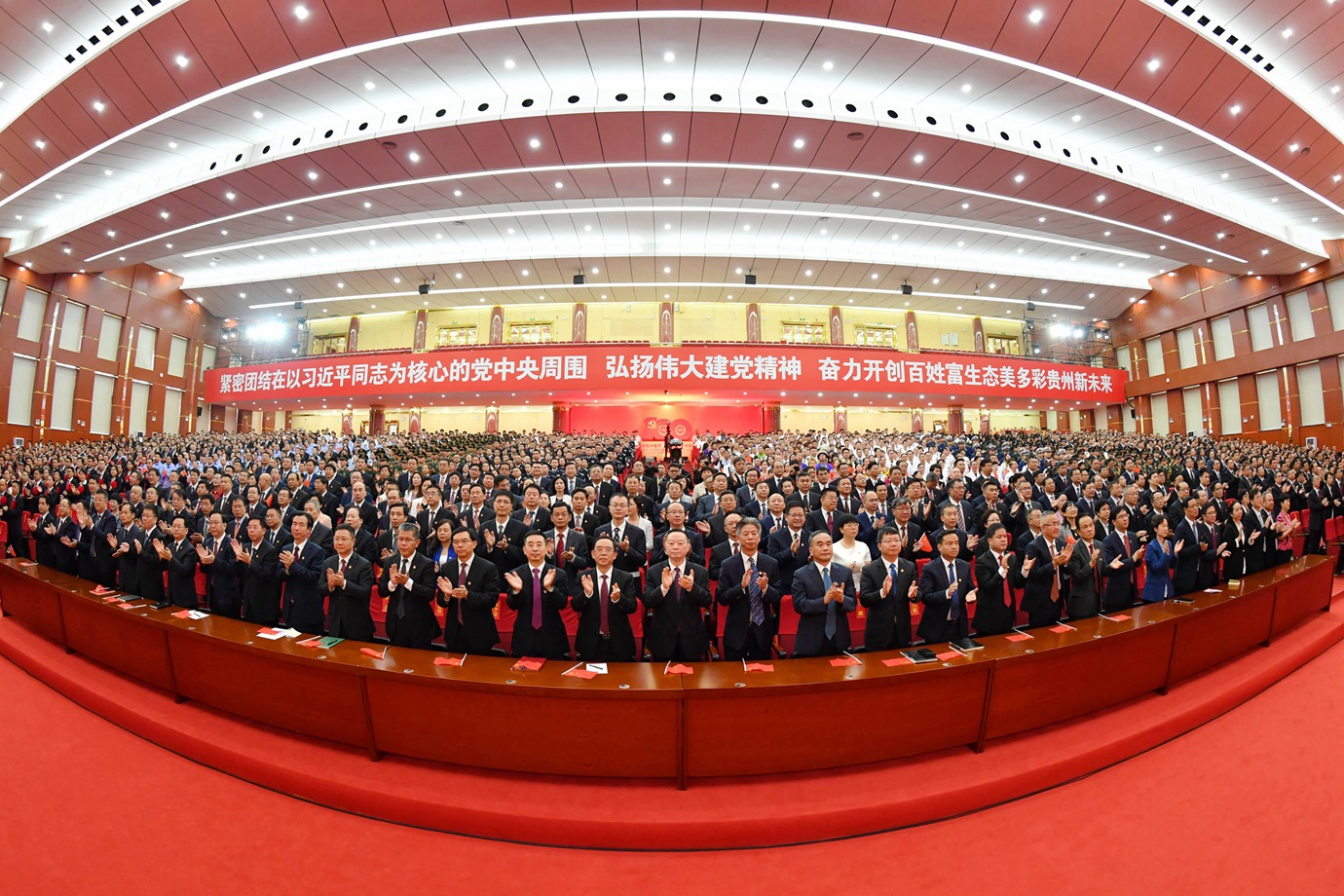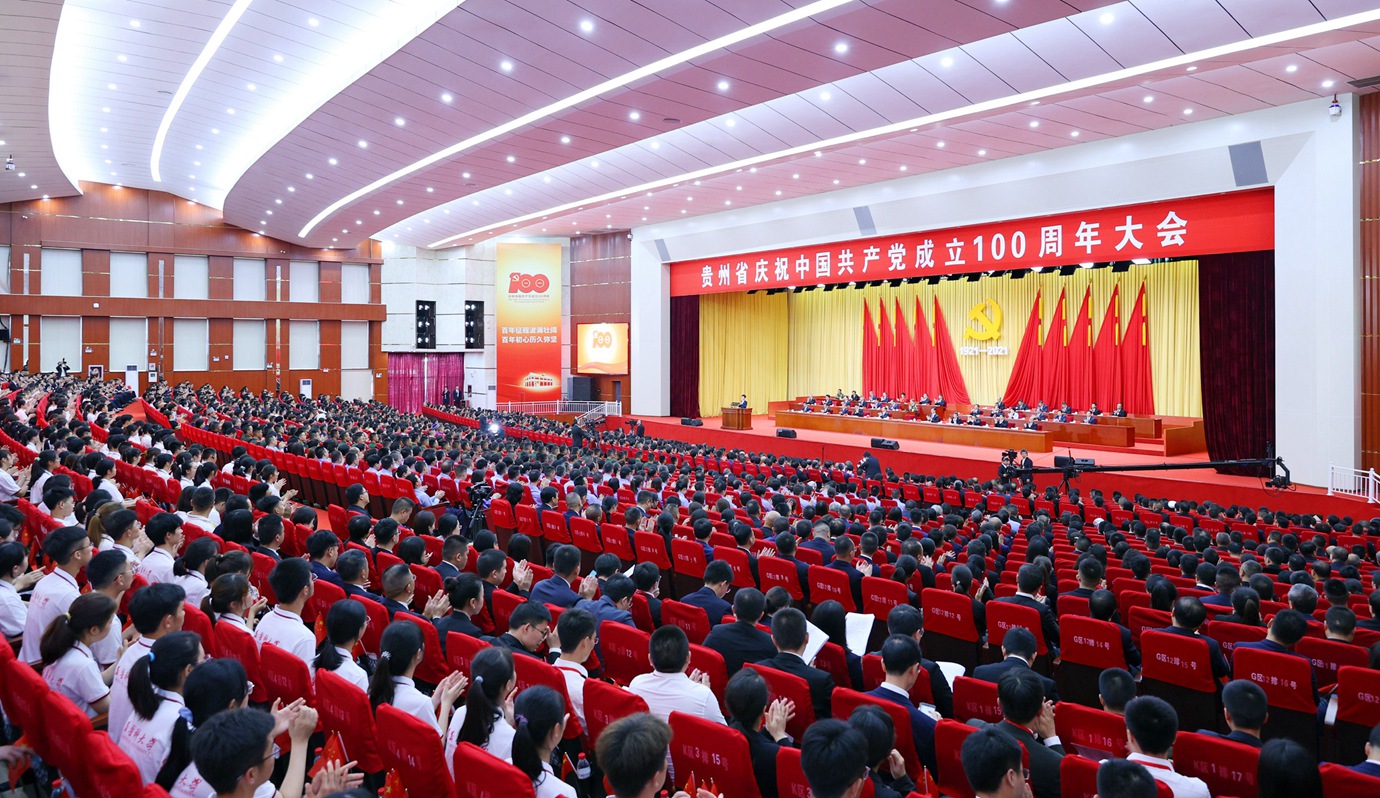 庆祝建党百年,贵州大地欣欣向荣、万众欢腾,红色遵义花团锦簇、旌旗飘扬。会场内,主席台上方悬挂着“贵州省庆祝中国共产党成立100周年大会”会标,帷幕正中是熠熠生辉的中国共产党党徽,党徽下方悬挂“1921—2021”字样,鲜艳的红旗分列两侧。二楼眺台上悬挂着“紧密团结在以习近平同志为核心的党中央周围,弘扬伟大建党精神,奋力开创百姓富生态美的多彩贵州新未来”标语。庆祝大会前,全场高唱《歌唱祖国》《没有共产党就没有新中国》等昂扬奋进的经典歌曲,抒发对党的热爱和祝福,会场内处处洋溢着热烈的喜庆氛围。