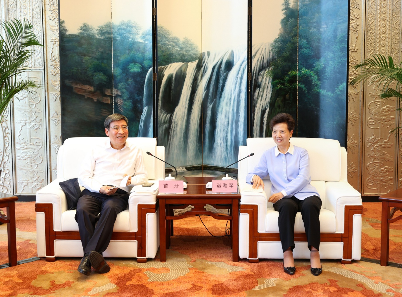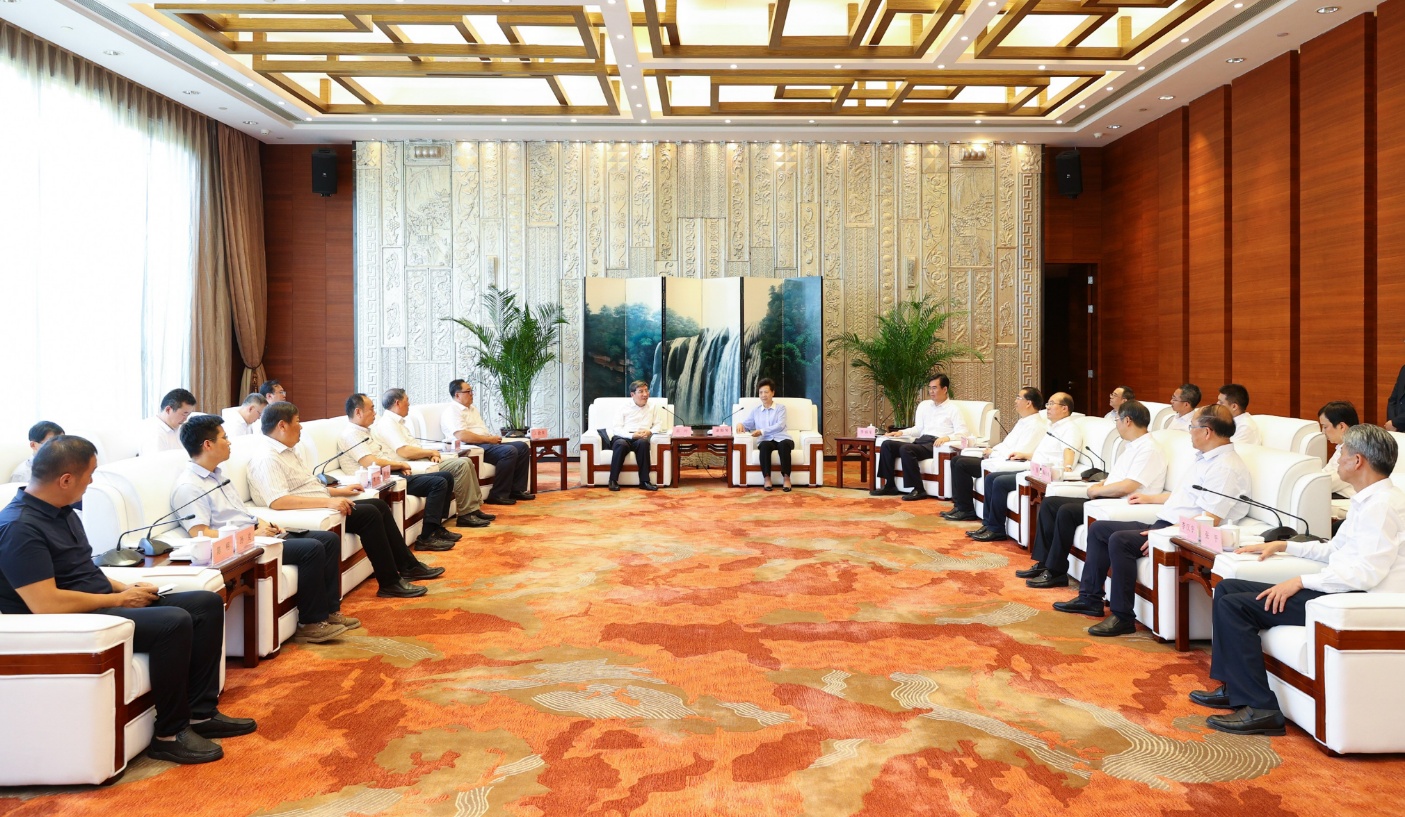 7月26日,省委书记、省人大常委会主任谌贻琴,省委副书记、省长李炳军,省政协主席刘晓凯在贵阳会见全国政协经济委员会副主任、工业和信息化部原部长苗圩率领的中国经济社会理事会专题调研组一行。全国政协常委王会生、刘卓明,省领导吴强、陶长海、李汉宇参加。
