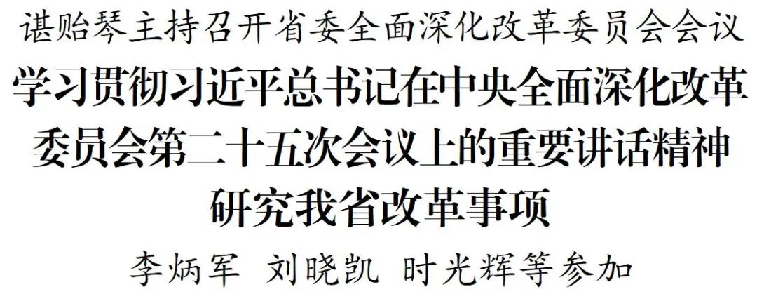 6月12日,省委书记、省人大常委会主任、省委全面深化改革委员会主任谌贻琴主持召开省委全面深化改革委员会会议,学习贯彻习近平总书记在中央全面深化改革委员会第二十五次会议上的重要讲话精神,研究我省改革事项。