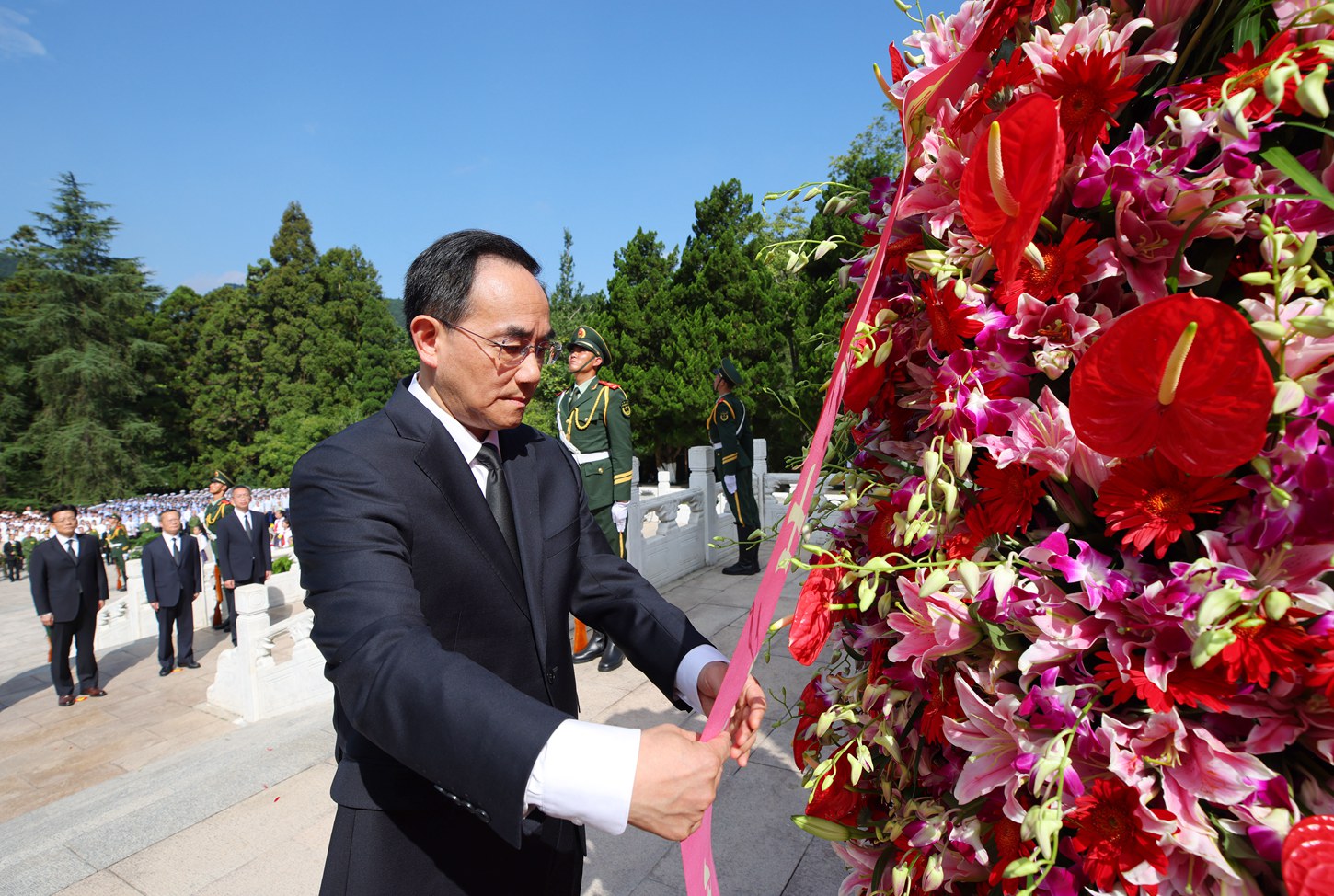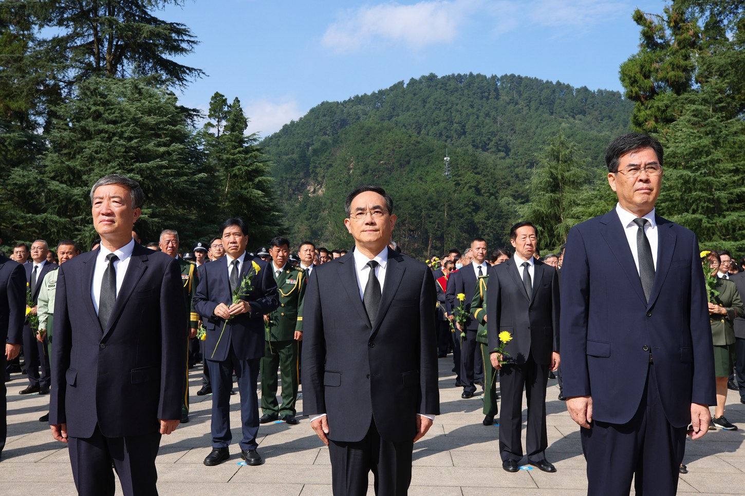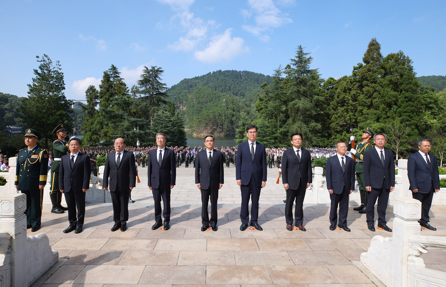 上午10时许,敬献花篮仪式正式开始。12名卫兵迈着铿锵有力的步伐,正步行进到纪念碑前持枪伫立。全场齐声高唱中华人民共和国国歌,雄壮的旋律、嘹亮的歌声,在纪念碑广场上空久久回荡。国歌唱毕,全场肃立,向英雄烈士默哀。默哀毕,少先队员献唱《我们是共产主义接班人》,并致少年先锋队队礼。随着深情的《献花曲》旋律响起,14名礼兵抬起花篮、正步前行,将花篮郑重摆放在纪念碑基座上。徐麟行至花篮前驻足凝视,仔细整理花篮缎带。随后,省党政军领导和社会各界代表依次缓步绕行,瞻仰纪念碑,表达对英雄烈士的深情追思和崇高敬意。