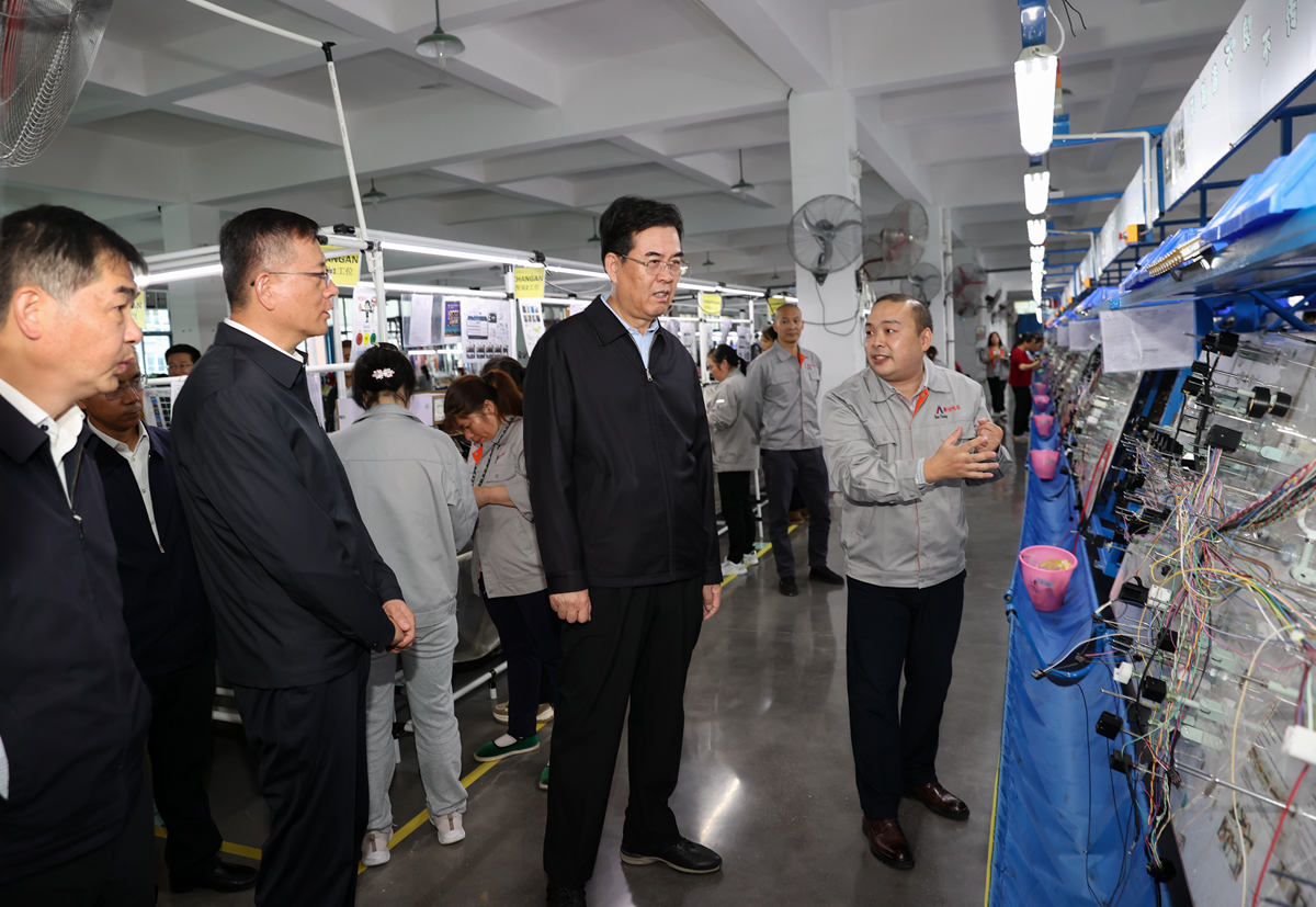 李炳军在贵州顺创电器股份有限公司,察看生产线和产品,希望企业提升装配水平和生产效益,不断增加群众务工收入。
