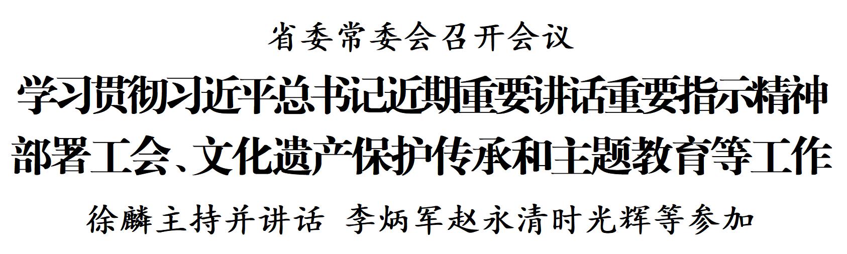 10月27日,省委常委会召开会议,学习贯彻习近平总书记同中华全国总工会新一届领导班子成员集体谈话时的重要讲话精神和中国工会第十八次全国代表大会精神,学习贯彻习近平总书记近期重要贺信精神,研究部署工会、文化遗产保护传承和主题教育等工作。