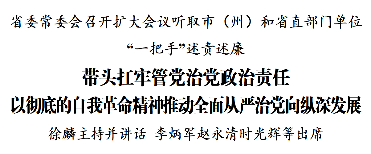 1月21日,省委常委会召开扩大会议听取市(州)和省直部门单位“一把手”述责述廉。省委书记、省人大常委会主任徐麟主持会议并讲话。省委副书记、省长李炳军,省政协主席赵永清,省委副书记、省委政法委书记时光辉,省委常委,省人大常委会、省政府有关负责同志,省法院院长、省检察院检察长出席。