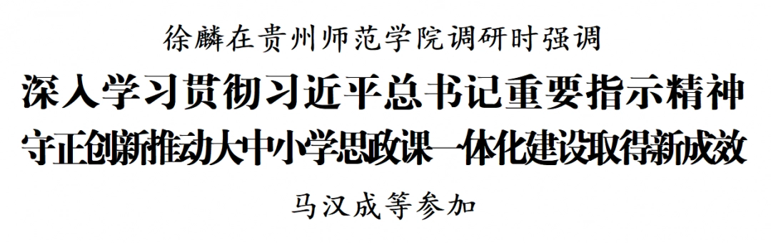 10月9日,省委书记徐麟到贵州师范学院调研大中小学思政课一体化建设工作。他强调,要深入学习贯彻习近平总书记关于思政课建设的重要指示精神,把思政课建设作为党领导教育工作的重中之重来抓,落实立德树人根本任务,守正创新推动贵州大中小学思政课一体化建设取得新成效。省委副书记马汉成,省领导卢雍政、郭强、张敬平参加。