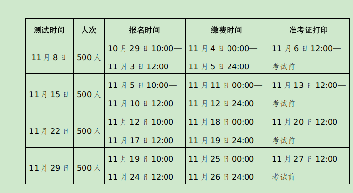 1.测试日期:11月8日、11月15日、11月22日、11月29日,考试当天报到截止时间以准考证上考生须知为准。