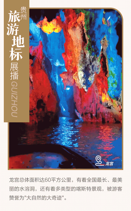 龙宫除两项大世界基尼斯之最——最大、最多的水旱溶洞群——“龙宫溶洞群”、天然辐射率最低的地方——“贵州龙宫风景名胜区”,世界纪录认证世界最大的植物汉字景观——“龙”字田等瑰丽奇特景观外,还有着许多神奇秀丽的喀斯特景观,其中备受游客推崇的还有:“全国最大的洞中瀑布——龙宫龙门飞瀑”;“山不转水转的旋水奇观——龙宫漩塘”等。