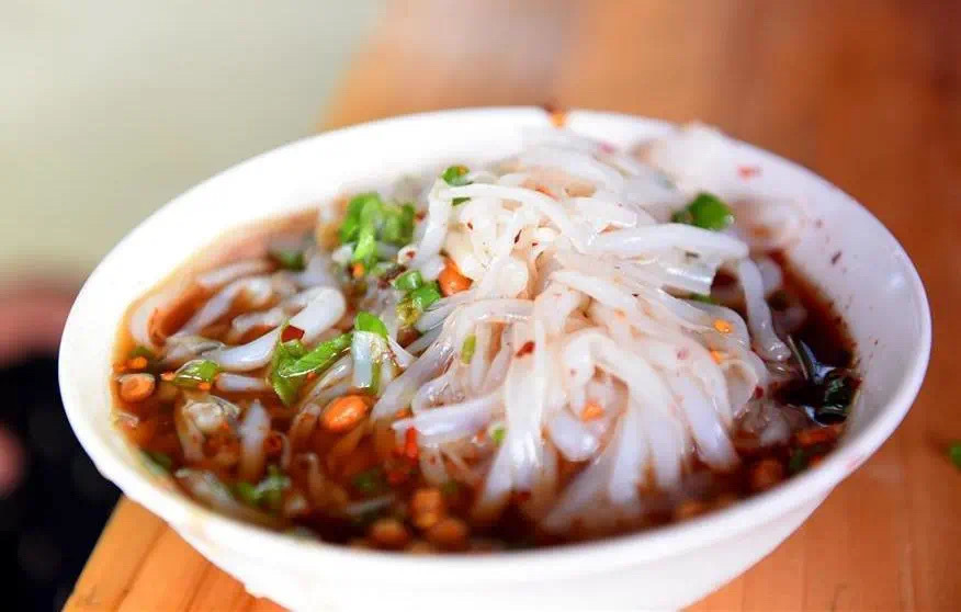荞凉粉:选用贵州高原特产甜荞加工而成,食用时可切成片,也可刮成条状。佐料很特殊,除一般的酱、醋、葱、蒜、姜、香油外,撒上油炸黄豆、花生米,加上辣椒油和安顺有名的豆腐乳,食之爽滑可口,其味甚佳,有荞子的清香味,围摊吃食者络绎不绝。