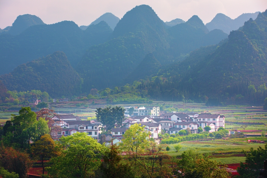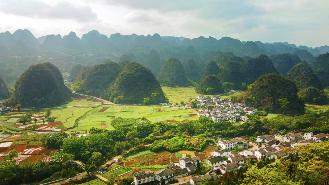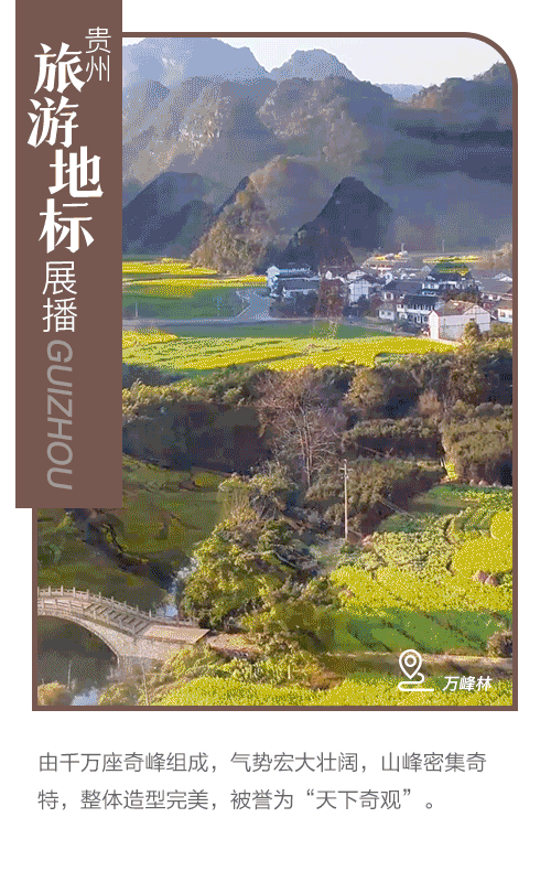 在万峰林景区,一座座奇美的山峦与绿油油的田野、弯曲的河流、古朴的村寨、葱郁的树林交相辉映,一幅绝美的田园画卷跃然纸上。
