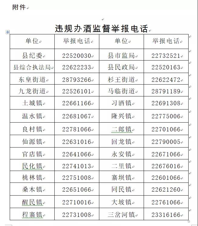 本通告自发布之日起执行。请广大干部群众积极配合,共同监督滥办酒席行为。