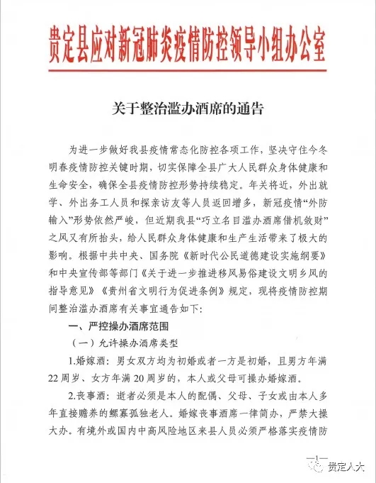 当前,全国疫情防控形势依然严峻复杂,为有效防范新冠肺炎疫情和冬春季传染病传播,阻断因滥办酒席造成人员扎堆带来的传播风险,切实保障全街道人民群众身体健康和生命安全。根据贵州省人民政府办公室厅《关于做好元旦春节期间新冠肺炎疫情防控工作的紧急通知》和市、区防控办工作要求:从即日起,除红白喜事外,一律不得举办其他任何酒席。婚嫁丧事酒席一律简办,严禁大操大办,并须向所在村(居)委会报备。有境外或国内中高风险地区来街道人员必须严格落实疫情防控相关管控措施。请各村(社区)、各部门、各单位严格按照规定执行。