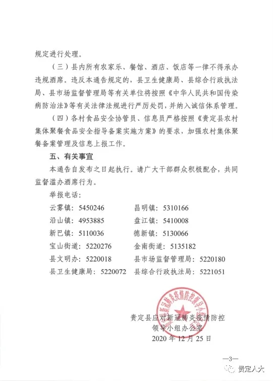 3.县区域内所有酒店、餐馆、农家乐等一律不得承办违规酒席。违反本通告规定的,由属地镇乡及县市场监督管理局、县综合行政执法局等有关单位将按照有关法律法规进行严厉处罚。