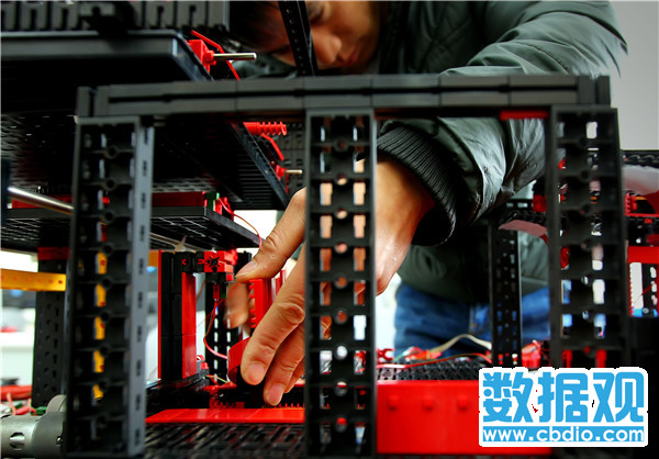 找到出问题的地方,一名同学小心翼翼地安装零件。因为智能化机械零部件都很精密,制作过程需要谨小慎微。