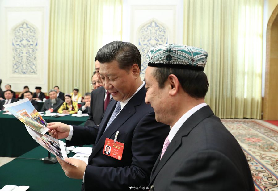 3月10日上午,中共中央总书记、国家主席、中央军委主席习近平来到十二届全国人大五次会议新疆代表团参加审议。