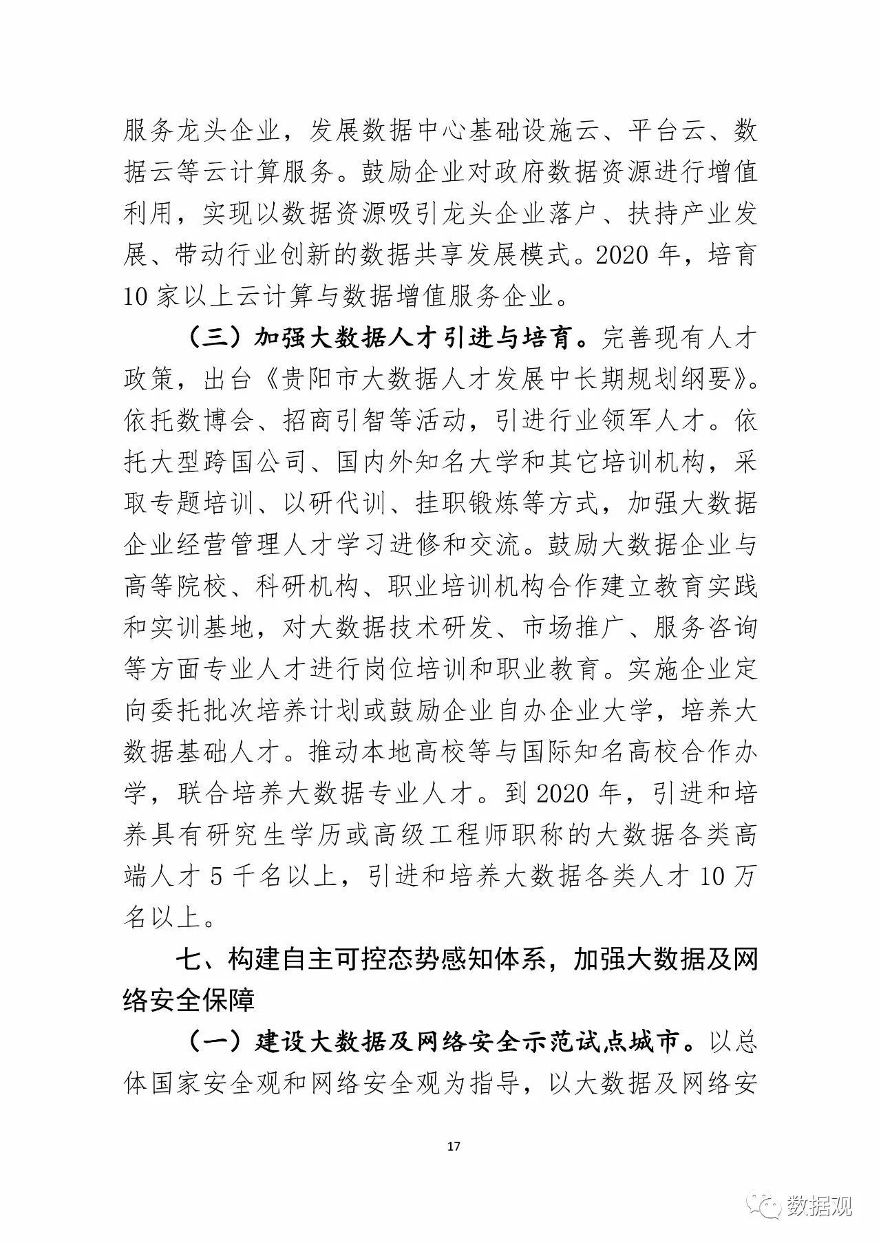 同时,我市将强化通信网络基础设施建设,建设以贵阳为核心节点,直连北京、上海、广州等地的城市直联网,完善城市光纤传输骨干网络,提升农村通信网络覆盖质量;建设一体化大数据中心,到2020年全市数据中心承载服务器能力达到50万台;加强大数据人才引进与培育,到2020年,引进和培养具有研究生学历或高级工程师职称的大数据各类高端人才5000名以上,引进和培养大数据各类人才10万名以上。