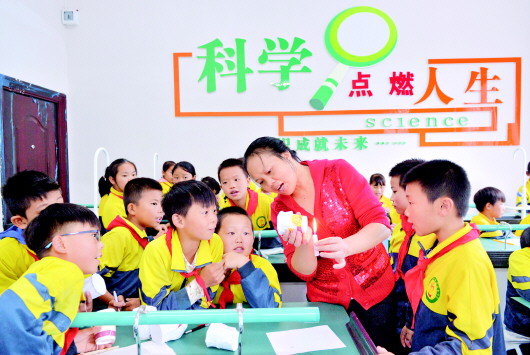 图为瓮安县建中镇乡村少年宫内,同学们在老师的指导下开展科学小实验。