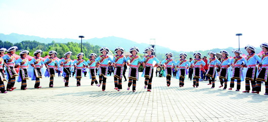 搬迁到晴隆县阿妹戚托小镇的群众跳起彝族舞蹈“阿妹戚托”。