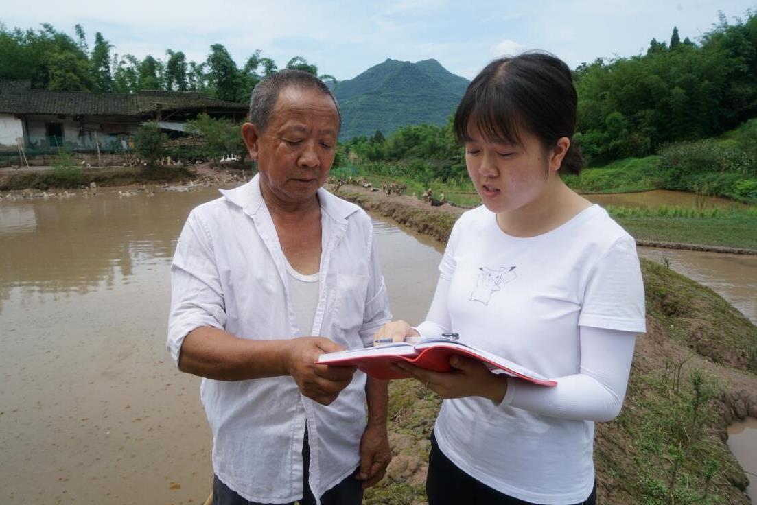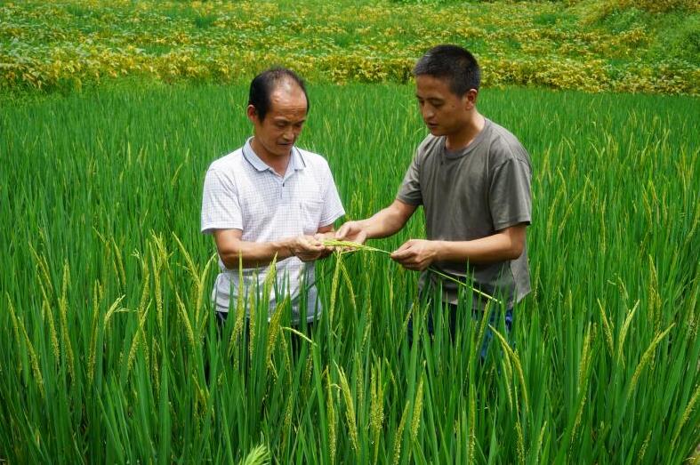 长期镇凤仪村,党支部书记和村民李少怀一起查看水稻病虫害情况