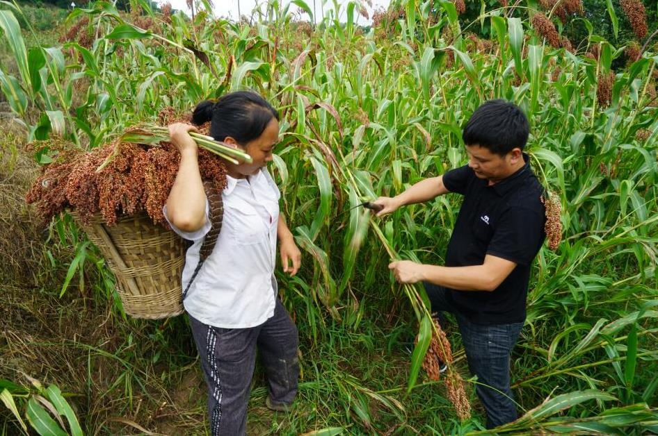 白云乡田渡村,村干部帮助村民蔡国芬收割高粱