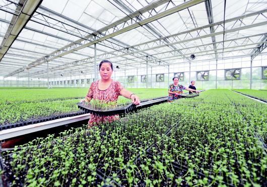 图为8月26日,村民们正在大棚里管护西兰花幼苗。