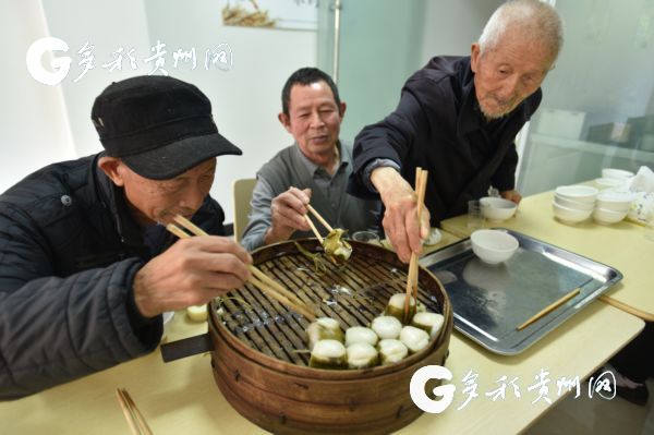 在赤水市大同镇移民扶贫搬迁安置小区内,几位老人正在享用“免费午餐”