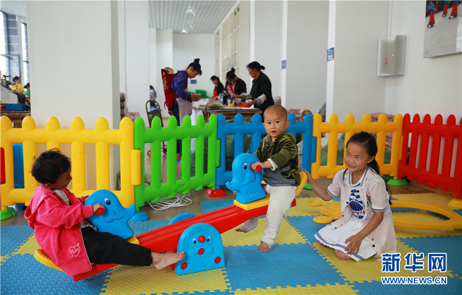 7月16日,女工们的子女在工作室一旁的儿童游乐区玩耍。