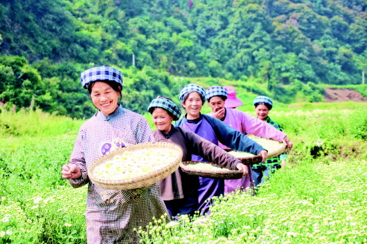 黔西南望谟县麻山镇牛场村菊花种植基地,民众采摘菊花,喜迎丰收。