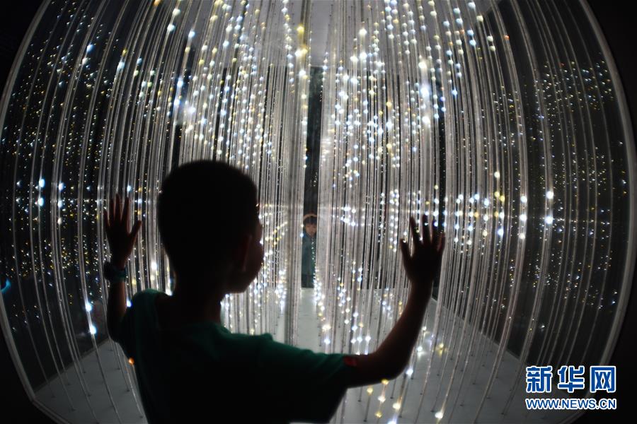 5月27日,一名孩子在数博会“追梦·未来”数字艺术特展上体验艺术作品《梦立方》。2019中国国际大数据产业博览会5月26日至29日在贵阳举行,作为今年数博会展览之一的“追梦·未来”数字艺术特展,以其独特的科技体验与艺术表现形式,吸引众多观众前来观展并体验。杨文斌 摄