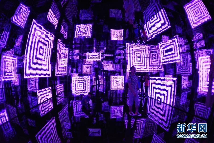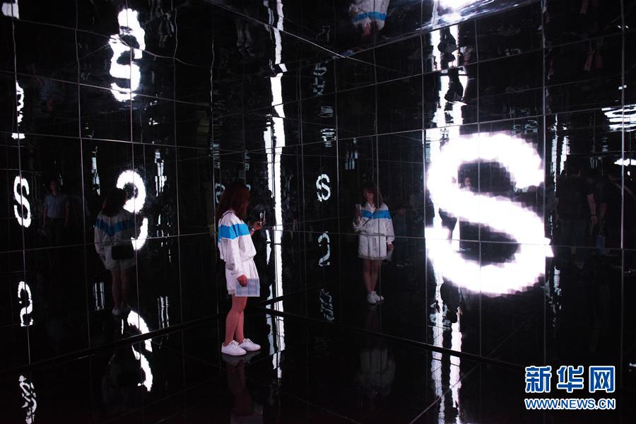 5月27日,观众在数博会“追梦·未来”数字艺术特展上体验艺术作品《棱镜》。2019中国国际大数据产业博览会5月26日至29日在贵阳举行,作为今年数博会展览之一的“追梦·未来”数字艺术特展,以其独特的科技体验与艺术表现形式,吸引众多观众前来观展并体验。杨文斌 摄
